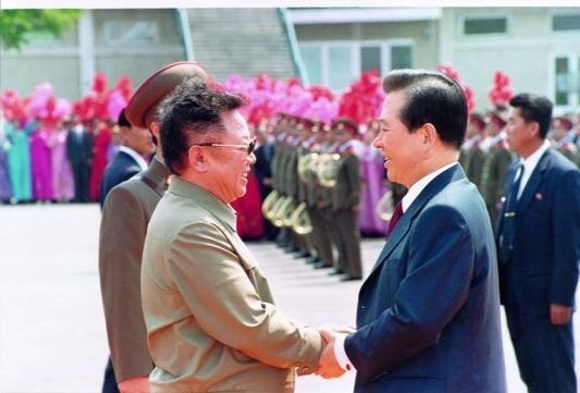 남북정상회담을 위해 2000년 6월 13일 평양 순안공항에 도착 한 김대중 대통령(오른쪽)과 직접 영접 나온 김정일 북한 국방위원장이 밝은 표정으로 악수하고 있다. [청와대사진기자단]